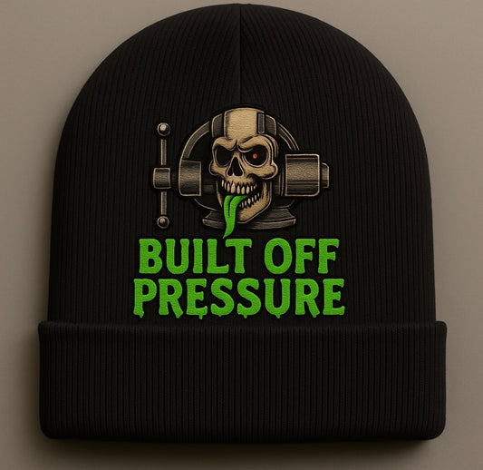Regular price $30.00 USDRegular priceUnit price perSale price $30.00 USDPressure creates greatness — and this beanie proves it. The Built Off Pressure Beanie features the iconic skull-in-vise design with neon green drip lettering. Perfect for colder days, late nights, or just flexing your story — this is a crown built for hustlers.